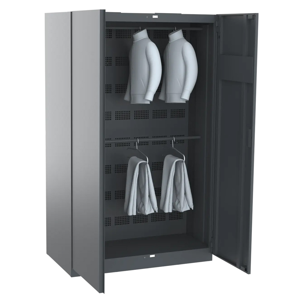 Der Innenraum ist für bis zu 16 Jacken oder Hosen ausgelegt. Die Kleidung wird übersichtlich an den 2 Kleiderstangen aufgehängt und gleichmässig belüftet, sodass grössere Mengen Arbeits- oder Einsatzbekleidung parallel getrocknet werden können. Der Schrank wird standardgemäss ohne Kleiderbügel geliefert. Passende Kleiderbügel Spezial sind jedoch separat als Zubehör erhältlich (siehe unten) und können je nach Bedarf flexibel ergänzt werden.